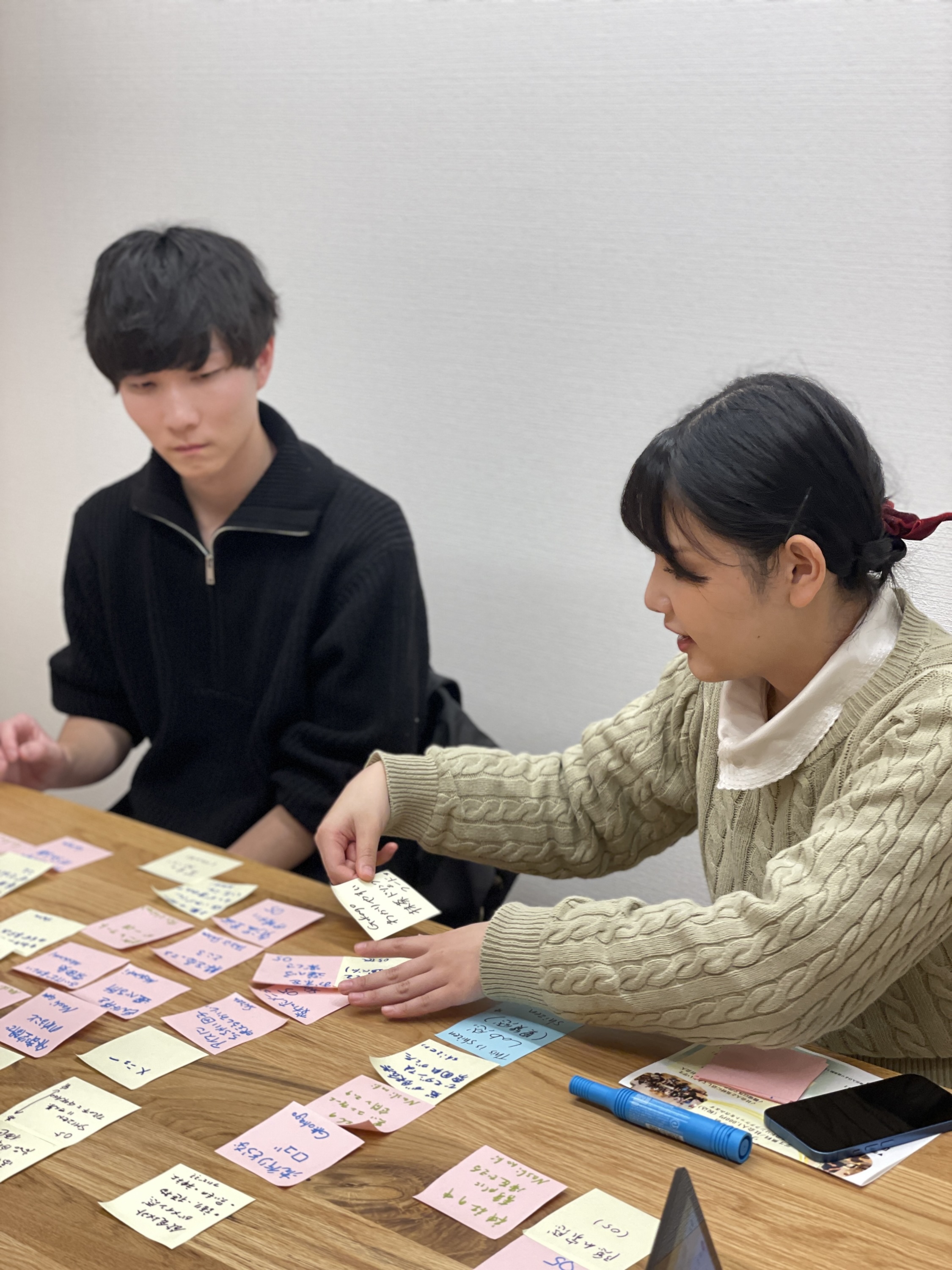 など、全員が同じ店舗へ調査に行ったにも関わらず、少しずつ異なる視点のアウトプットがたくさん出てきました。お互いのアウトプットを聞きながら、新しく思いついたものも追加していきます。そして、机の上に出てきたバラバラのアウトプットをまとめるため、全員でカテゴライズし、整理していきます。